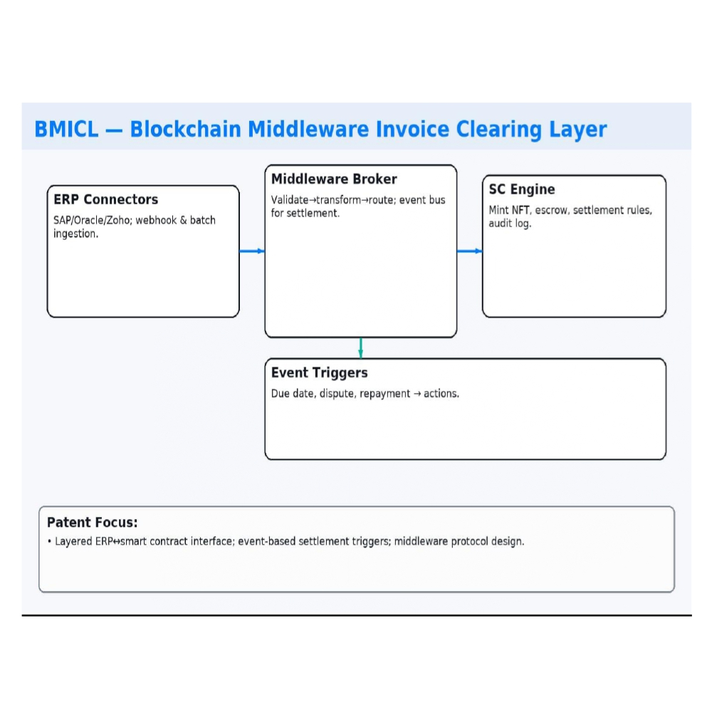 This patent discloses a blockchain middleware platform that bridges enterprise ERP systems with blockchain smart contract engines to validate, transform, and tokenize invoices into metadata-rich, risk-scored digital assets.