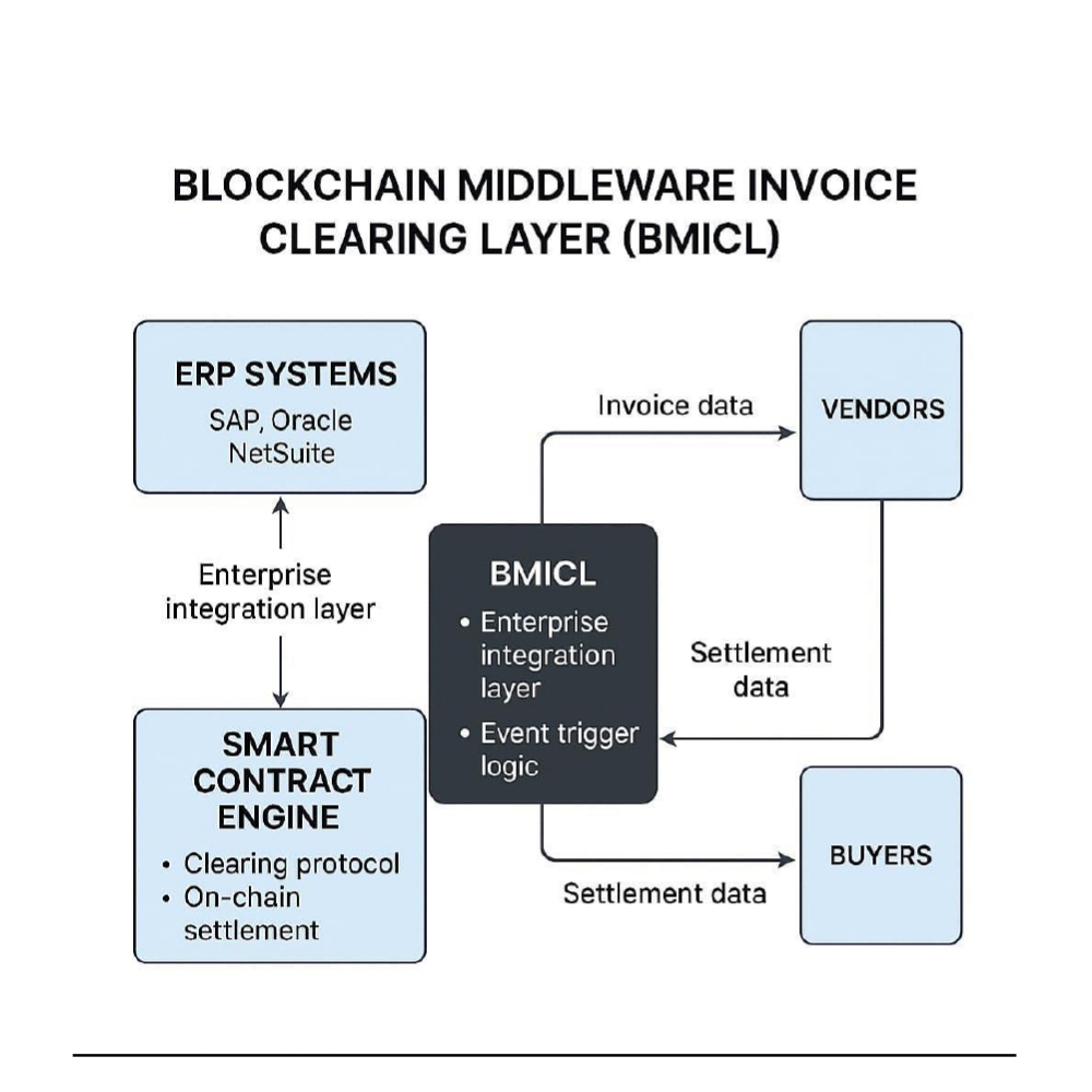 The present invention relates to a Blockchain Middleware Platform for Automated Invoice Validation, Transformation, and Settlement. More specifically, it pertains to a layered middleware architecture that bridges ERP-generated enterprise invoices with blockchain-based smart contract engines, enabling tokenization of invoices into blockchain assets enriched with AI-powered risk scoring, compliance data, and programmable escrow mechanisms. The invention further relates to event-driven settlement workflows, automated liquidity governance, and decentralized finance (DeFi) integration, thereby facilitating secure, transparent, and efficient invoice financing and clearing operations across multi-chain blockchain environments.